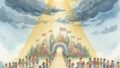 暗い過去から明るい未来へと続く橋を歩く多様な人々のイラスト。周囲には希望を象徴する桜と新緑が広がっている。 トレンド